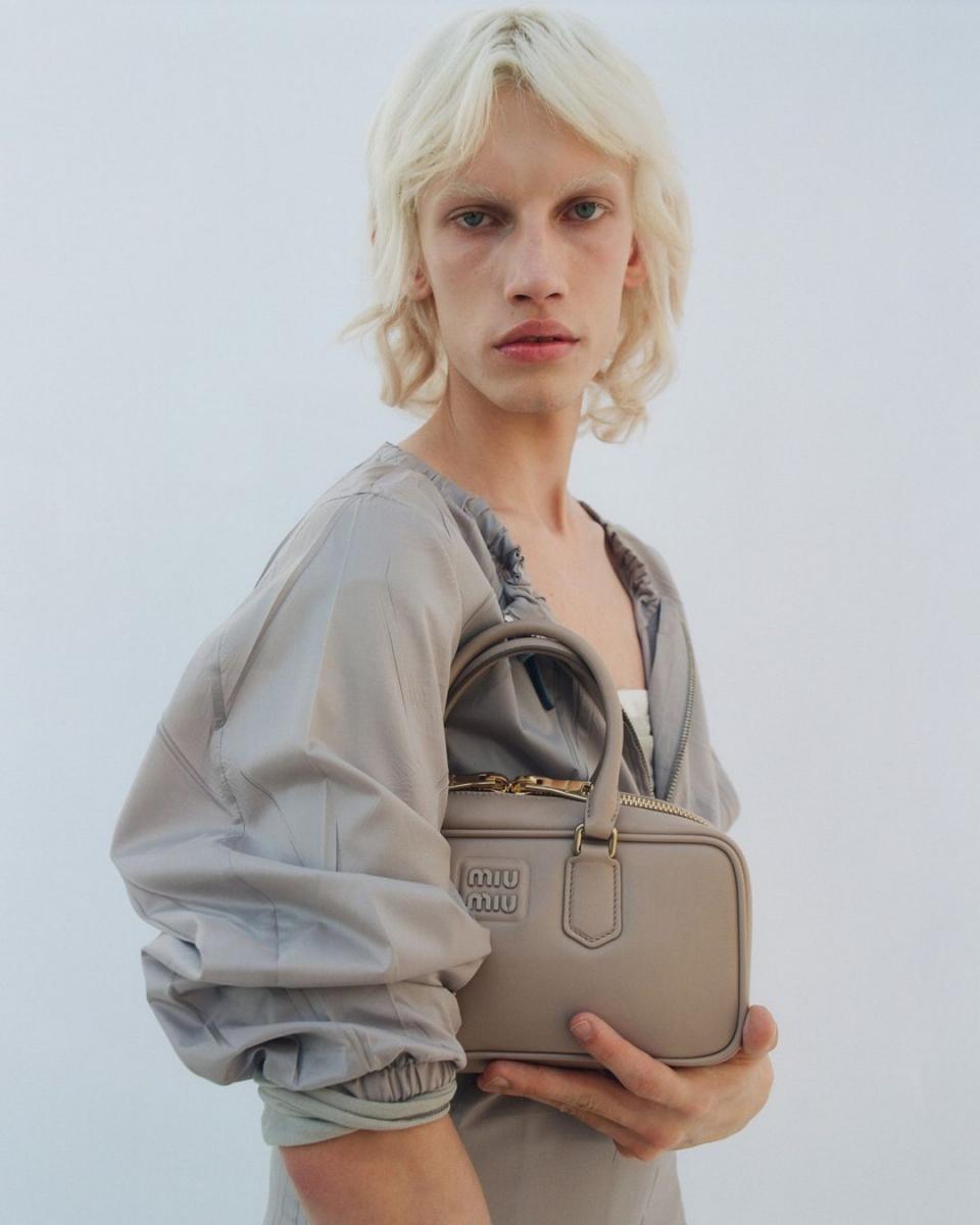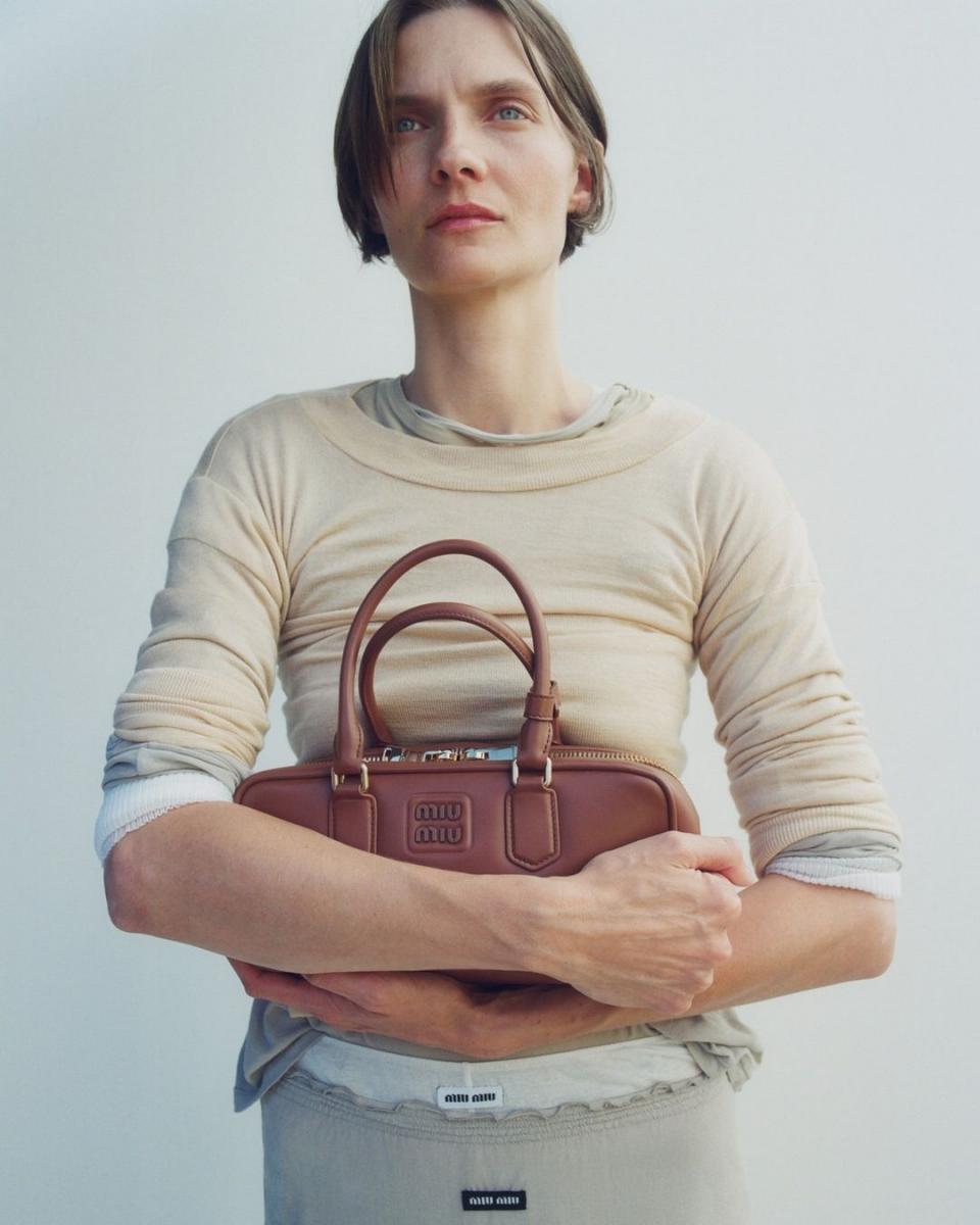 曾經出演《王冠》第四季飾演年輕黛安娜王妃的Emma Corrin,被Miu Miu相中找來拍攝形象照,水靈古怪的神情,手裡拿著方正的肩背包款,金屬扣環上鏤刻上品牌的字樣,搭配上溫潤的奶油白色,非常適合年輕的女孩們日常搭配使用。