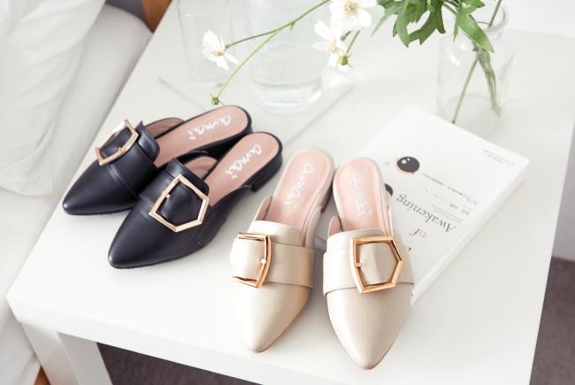 杏仁鞋頭鞋推薦七:時尚金屬釦尖頭低跟穆勒鞋