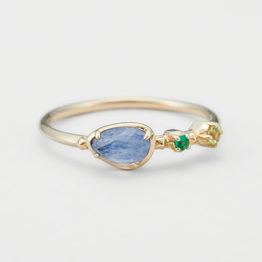 儂編本季最鍾愛的款式,對這種精細小巧的模樣完全沒有抵抗力!不對稱的設計,一顆強調礦石的天然感的藍紋瑪瑙,濃縮了天空的色彩,又以祖母綠、橄欖石點綴,讓人完全無法移開視線。(官網建議售價:NT$14,500。)