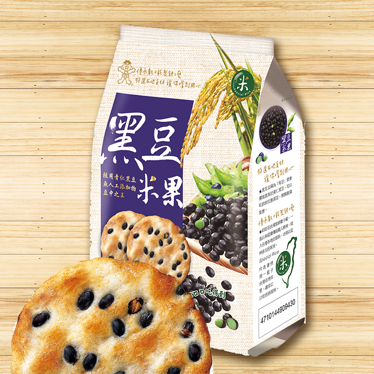 添加黑豆的國產黑豆米果,使用台灣在地生產稻米以及黑豆製作,黑豆營養價值高,與米果的結合,讓米果吃起來相對健康,每一口都吃得到滿滿的黑豆,增加米果的口感之外,也讓人吃得更有飽足感!