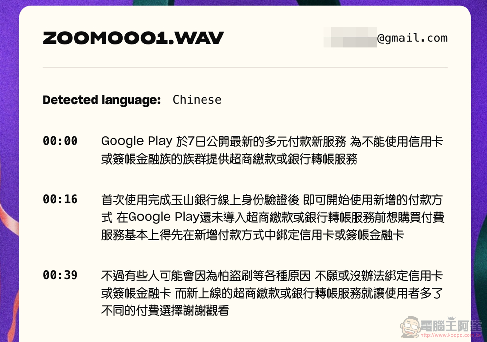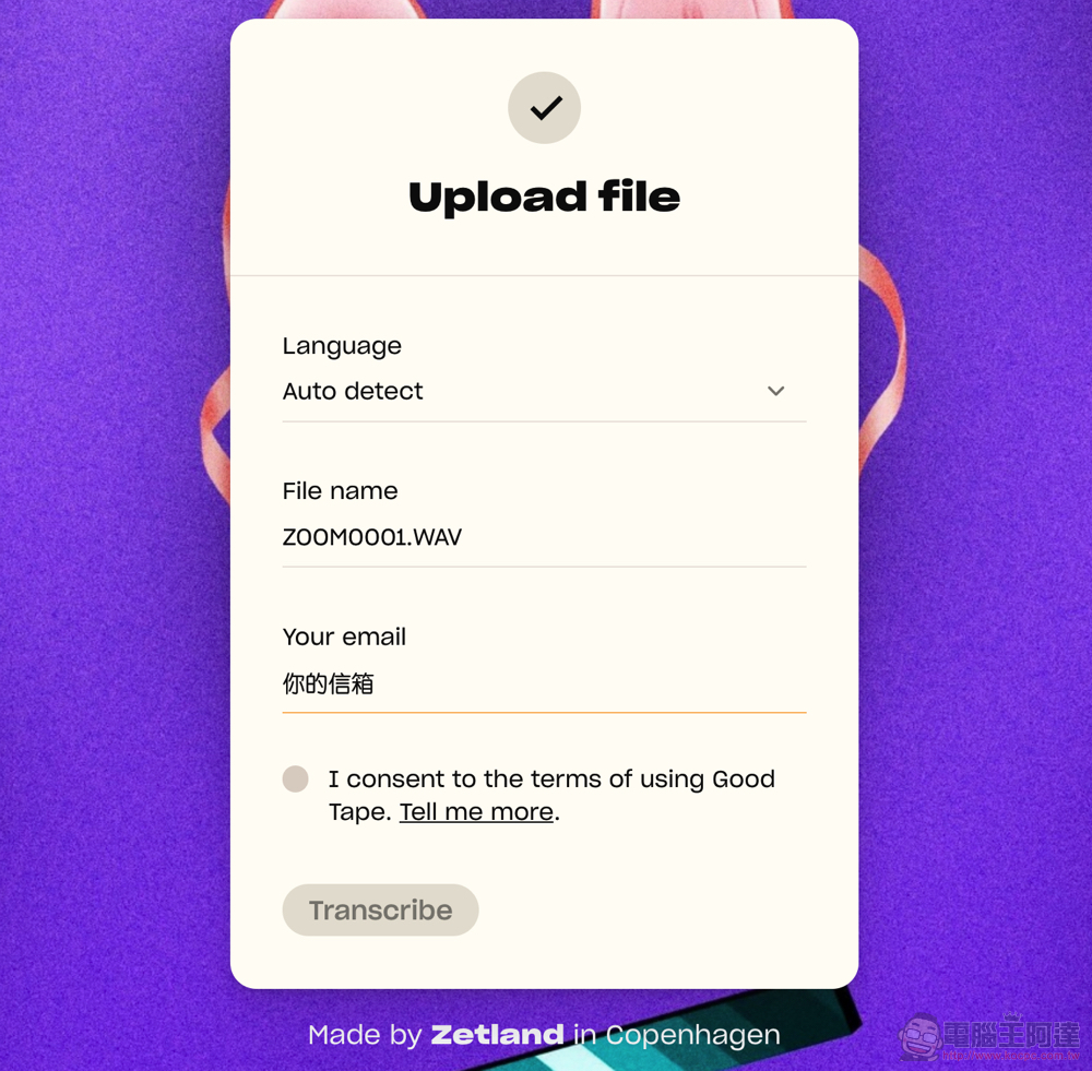 基本上點擊上方的「Upload file」選擇語音檔案,底下就會自動帶入檔案名稱。因此你只需要輸入自己的信箱就好(語系的部分想選可以選,但我沒選也正常辨識了 - 是不是真的蠻強的?):