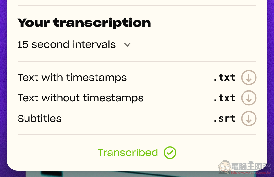除了有時間標籤的 TXT 文字檔,底下還可以產生字幕的 SRT 檔案... 相信對於做影片的人這服務也會相當有用!: