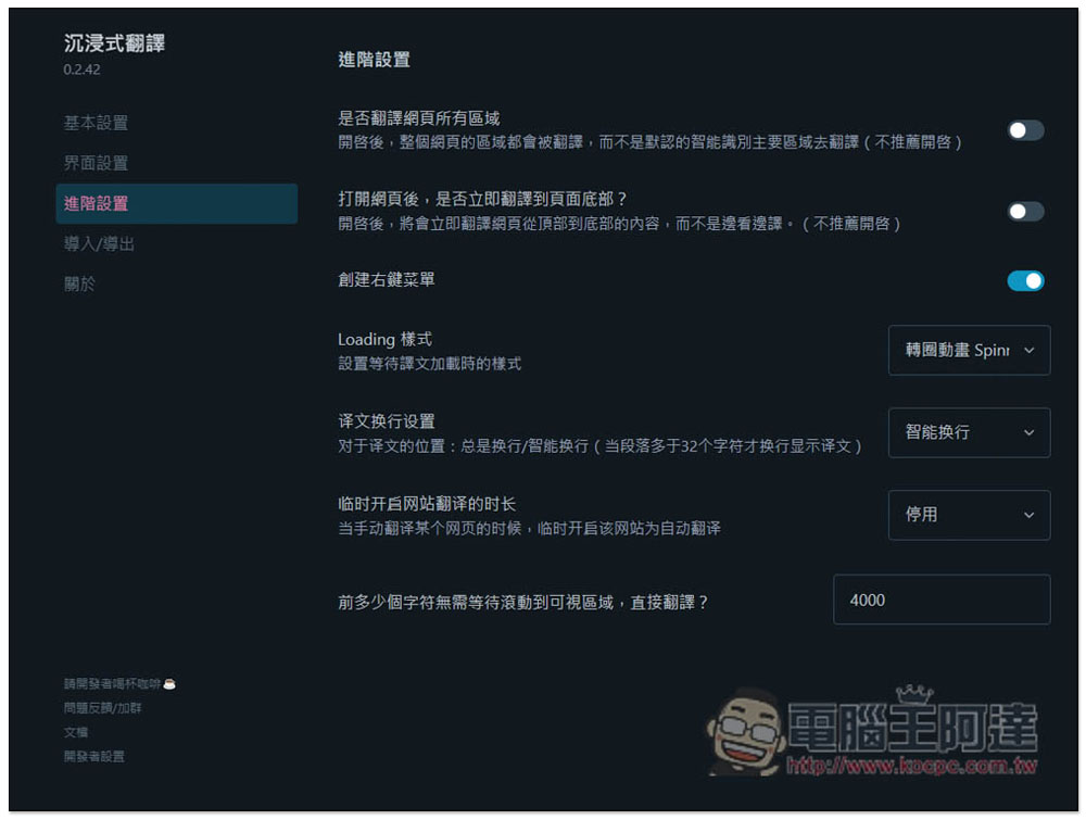 進階設置中,可決定是否要翻譯網頁所有區域、Loading 樣式、譯文換行設置等等: