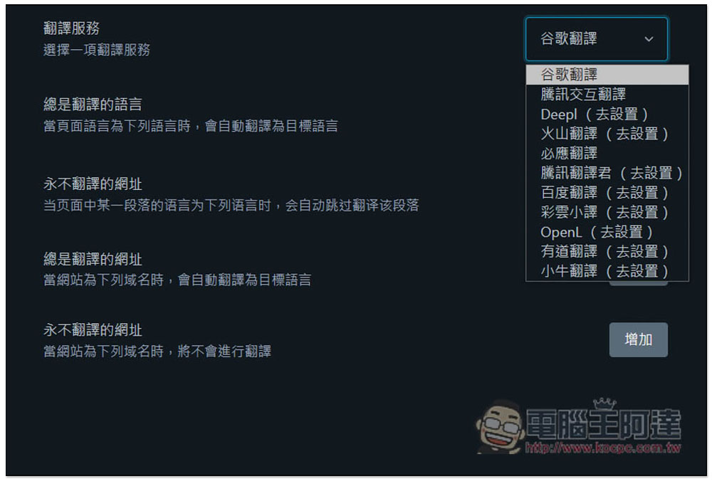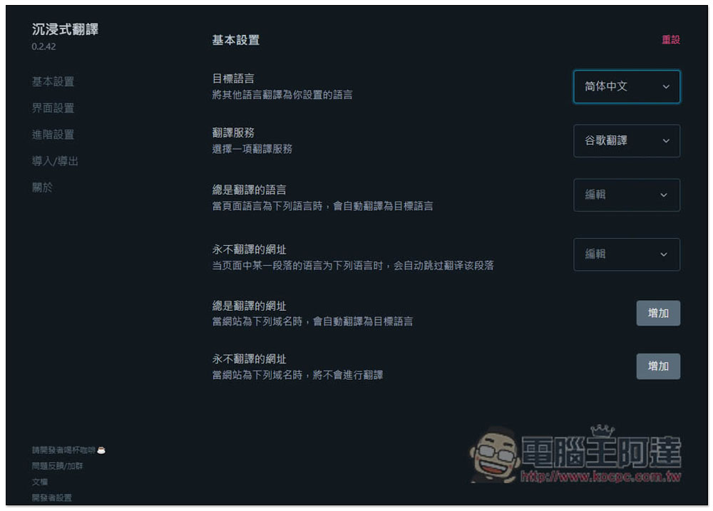 這款有提供蠻多設置調整的,翻譯的目標語言預設為「簡體中文」,可改成繁體中文,翻譯服務則是 Google 翻譯,如果你希望打開某些語言的網站直接啟用自動翻譯,可於 "總是翻譯的語言" 中設定,也能添加「總是翻譯的網址」與「永不翻譯的網址」: