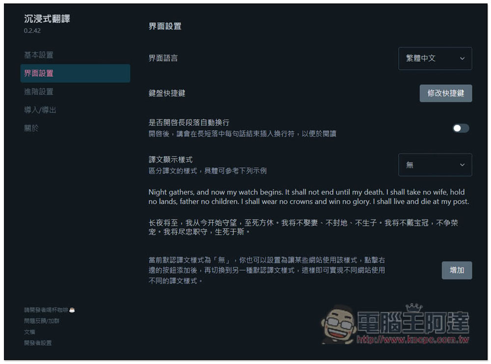 介面設置部分,可調整語言、鍵盤快捷鍵、譯文顯示樣式等,比較值得注意的是譯文顯示樣式,這邊可能設定你希望的原文、譯文顯示樣式: