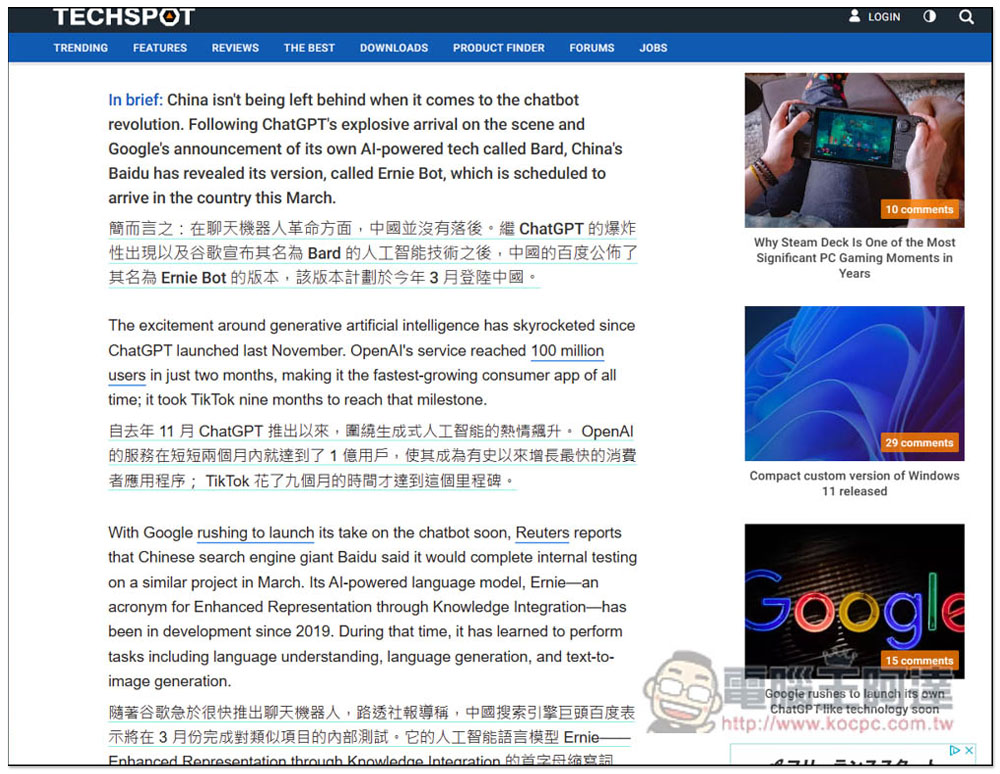 如果是使用瀏覽器的整頁翻譯,會將所有內容都變成中文,如果想要查詢原文,就必須關掉整頁翻譯功能,又或是打開同一個新分頁,查起來非常不方便: