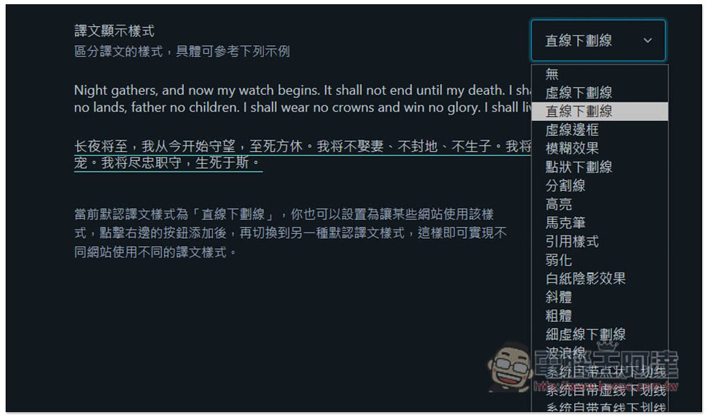有非常多樣式選擇,包括「虛線下劃線、需現邊框、模糊效果、點狀下劃線、分割線、高亮、馬克筆、引用樣式、弱化、白紙陰影效果、協體、粗體、細虛線下劃線、波浪線等等」,看你覺得哪一種最不影響閱讀,就用哪一種,像我比較喜歡譯文有個底線,就選擇直線下劃線: