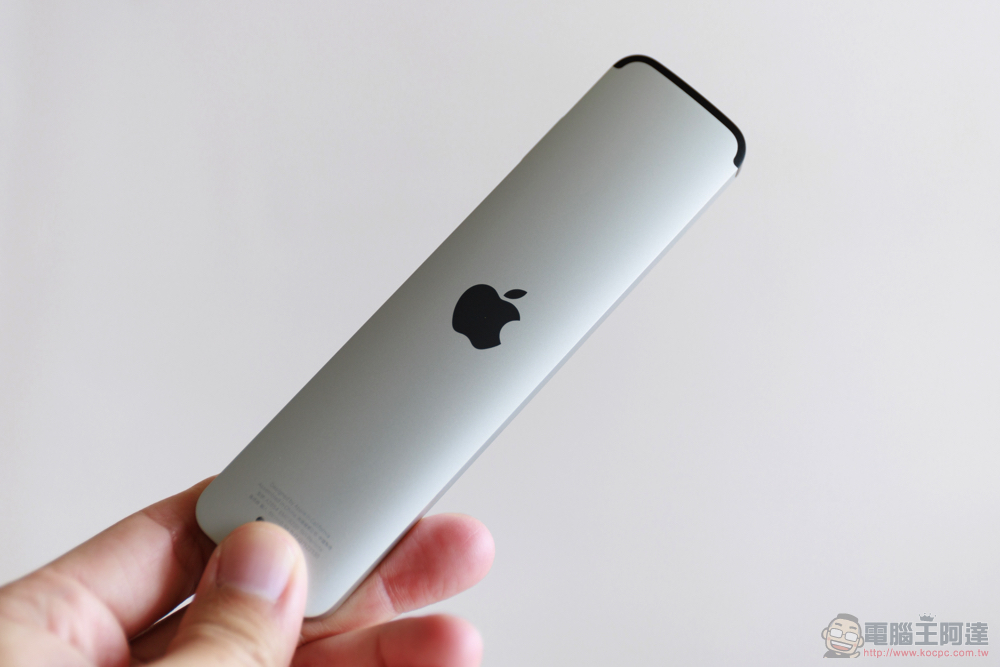 鋁金屬質感滿滿的遙控器背面。對了,Apple TV 的遙控器不僅具備藍牙連線的能力,也能夠透過 IR 或 CEC 來控制電視機。這些在初始設置時都會指引你設定,只要電視機有在支援範圍內,基本上想看電視就是直接拿這個遙控器打開就可以輕鬆開機與調整電視機的音量(有連接 HomePod 的話就是 HomePod 的音量):