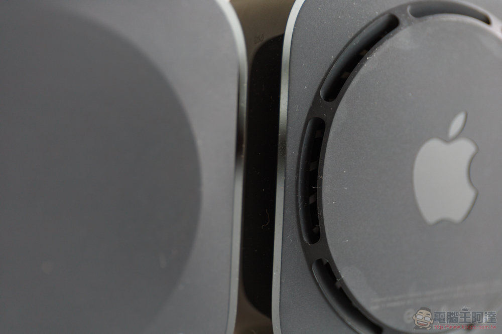 主要的差異是因為在 A15 仿生晶片確保效能與被動散熱兼具的前提下,將主機內在直接取消了主動散熱的風扇。從底部看來,左側的新款就完全沒有開孔(還少了 Logo);右側的舊款在底部就有散熱用的孔位設計: