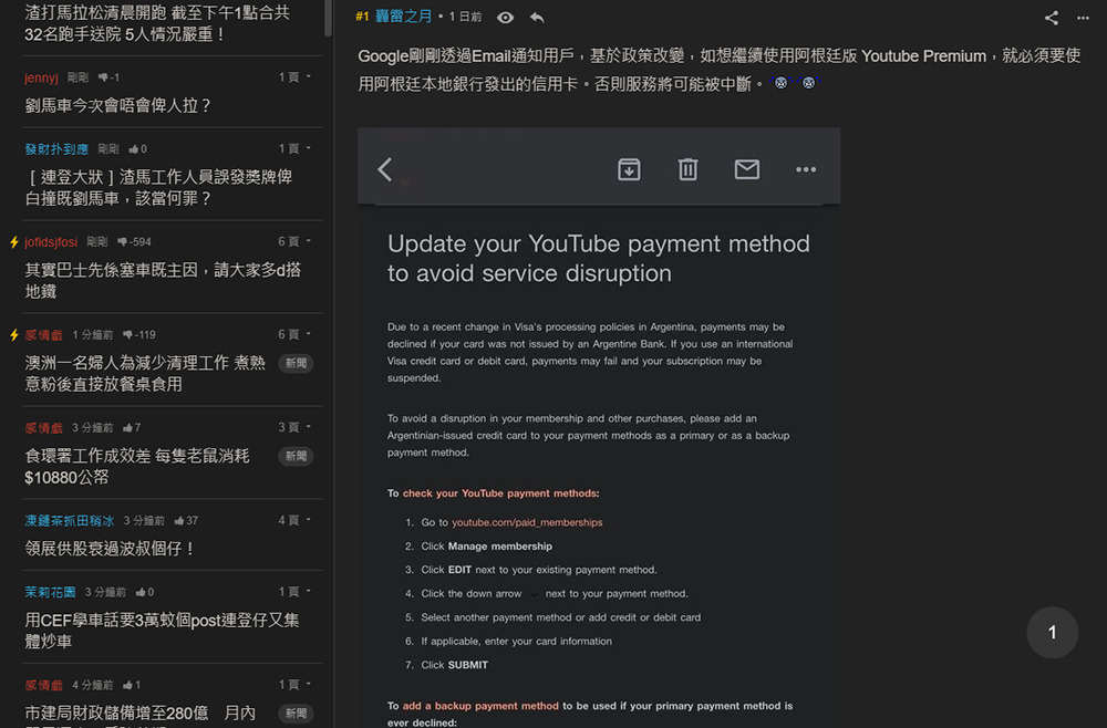 不過就在最近,國外論壇開始出現相關的討論串,像香港的 LIHKG 討論區中,就有一位「轟雷之月」用戶分享他剛剛收到 Google 發出的 Email 通知,標題為 "請更新你的 YouTube 付款方法,來避免服務中斷",內容就有一句提到「如果使用國際信用卡或金融卡,付款很可能會失敗,進而導致你的訂閱中斷」,不過這封主要是在講 VISA 信用卡: