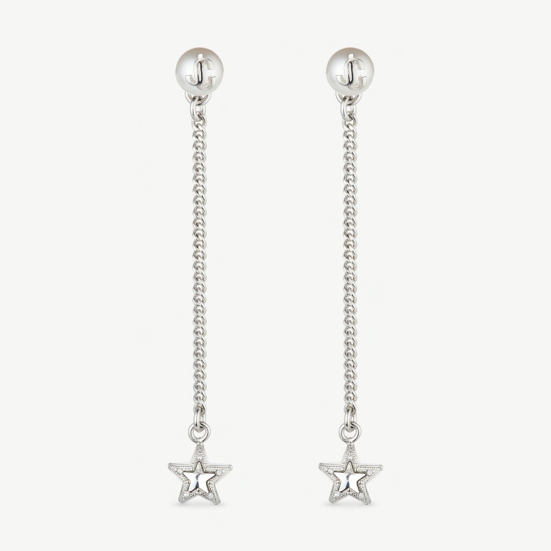 Jimmy Choo不只在女人的高跟鞋上發力,也正在進攻女人的飾品櫃,這款珍珠長耳環,用珍珠搭配銀色的鏈條,在末端點綴上一顆星星,只要搭配簡單的服裝,就能在派對現場留下深刻的印象,更是閃瞎眾人!(價格店洽)