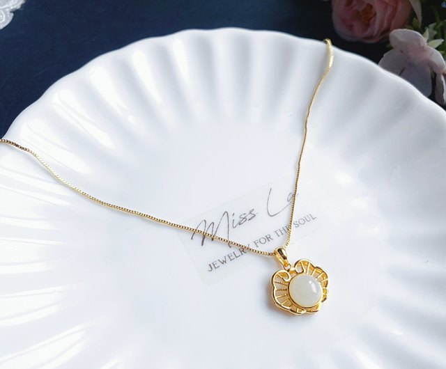 這款飾品以金屬元素結合高貴的白玉,優雅之餘更增添了幾分奢華氣息。五金方面採用的是保色的18K真金包銅配件,具有不易掉色、保色持久、防過敏等優點,即使用了一段時間後依然能維持光亮如新。更棒的一點是,此項鍊具有長度調節功能,可依照當下穿搭及心情隨心變換。