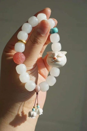 喜歡貓咪的人可以選這一款~作為視覺焦點的根付貓咪其實是卡在和服及腰帶之間的固定物,用於吊掛隨身物品。取下後與天然和闐白玉及鹽源牡丹花珠、綠松石、粉澳寶等晶石共同打造出夢幻又童趣的手環,是不容易撞款又能展現個人風格的開運飾品呢!