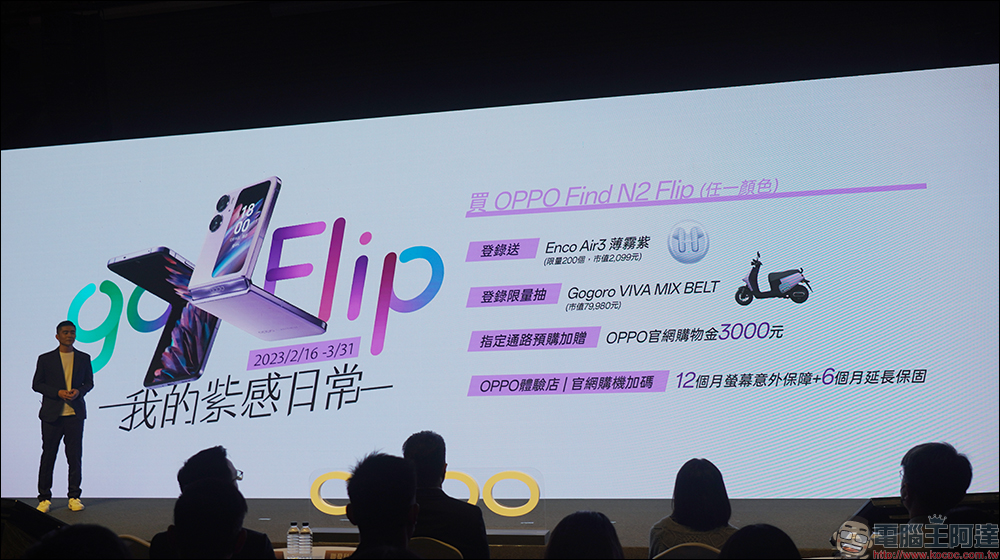 購買 OPPO Find N2 Flip ,於官網登錄即贈 OPPO Enco Air3 薄霧紫(價值 NT$2,099,限量 200 組),還能抽「Gogoro VIVA MIX BELT」乙台(價值$79,980)。