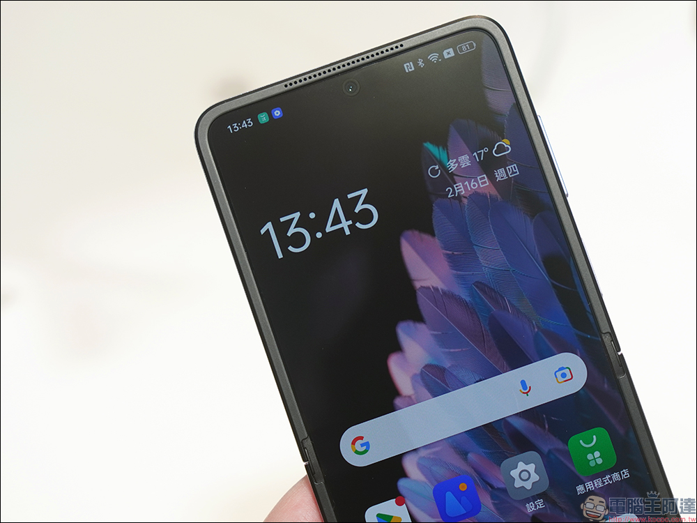 Find N2 Flip 外螢幕搭載 3.26 吋(720*382 解析度)、 17:9 比例的 AMOLED 螢幕,支援 60Hz 更新率。