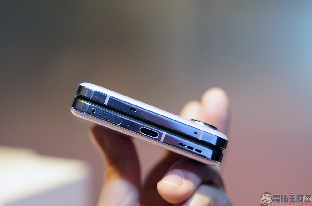 Find N2 Flip 的轉軸材料選用航太級新材料,不僅強度提升15%,精密且複雜的工藝保證轉軸穩定性。水滴型態使螢幕彎摺半徑增大、變形更小、摺痕變淺。側邊指紋辨識則設計於機身中框處。