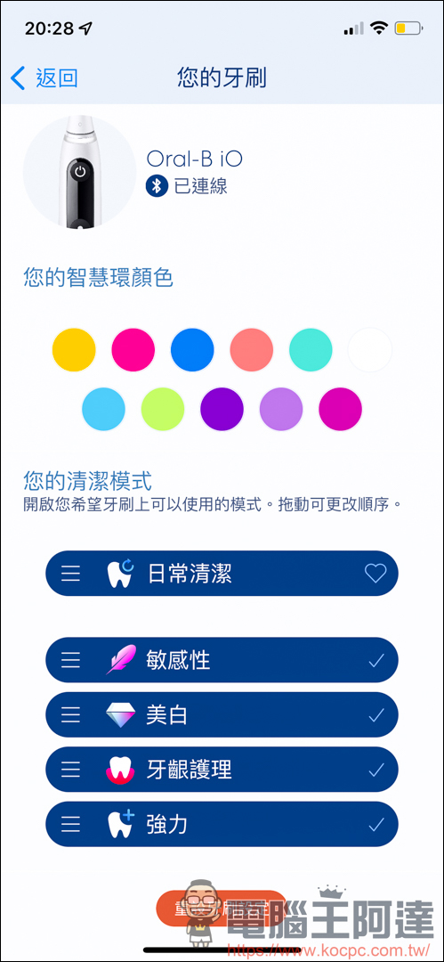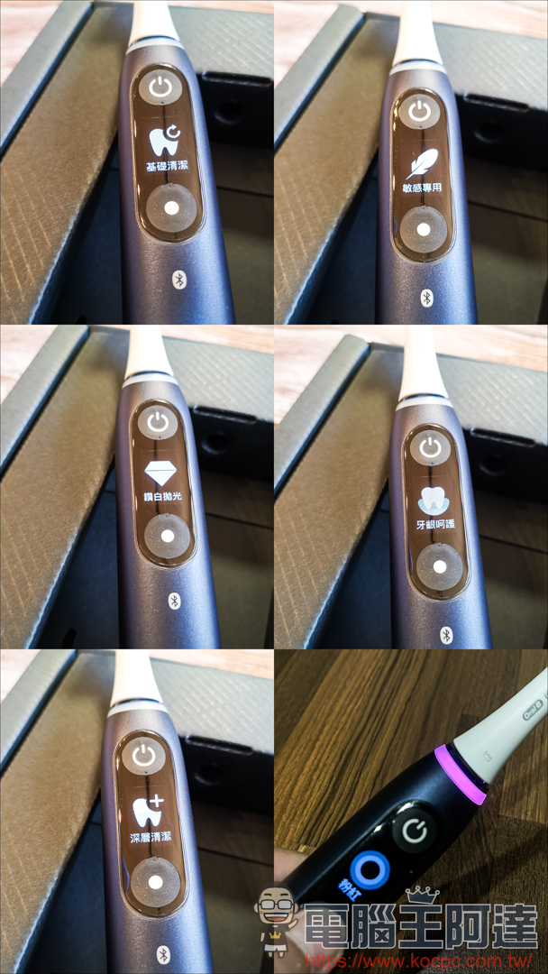 握把上的LED智慧螢幕可顯示多種使用功能,操作非常簡單,Oral-B iO7 的面板為單色,共有5種模式「日常清潔、敏感專用、鑽白拋光、牙齦呵護、深層清潔」,只需要一鍵就可選擇你要使用的模式,不需要另外使用手機切換,非常方便!