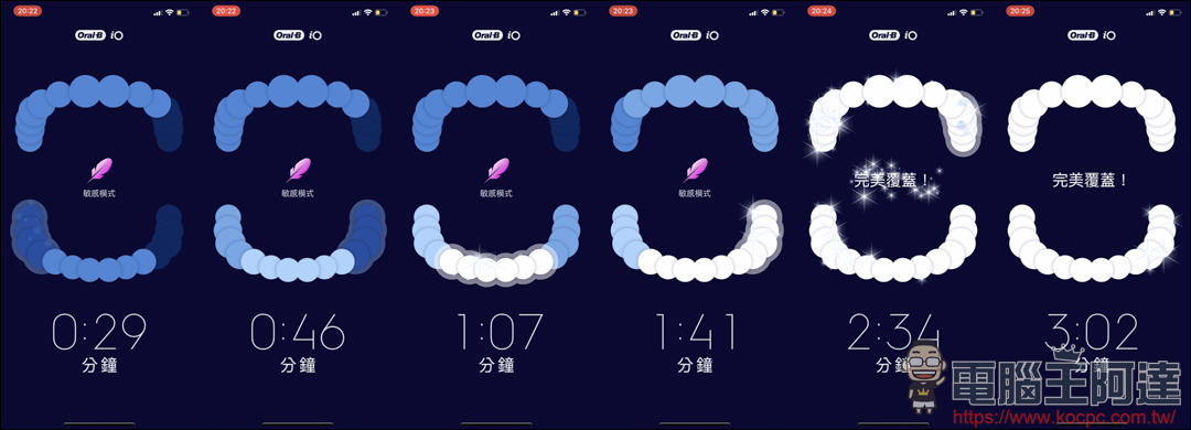 歐樂B Oral-B iO7電動牙刷在刷牙時可偵測到6區潔牙情況,開始刷牙後,感應到刷牙區域與清潔進度會同步傳到APP上,即時知道自己的刷牙情況,不漏掉任何一個區域,引導正確刷牙方式,有效清潔牙齒: