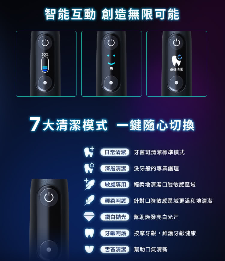 - LED智能面板可顯示日常清潔、敏感專用、鑽白拋光、牙齦呵護、深層清潔…多種模式