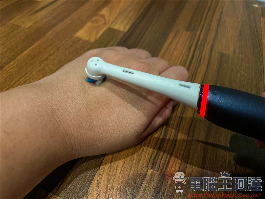 歐樂B Oral-B iO微震科技電動牙刷機身上有一圈「壓力感應燈」,刷牙時可以測壓力大小,力道太輕顯示白色,力道適中顯示綠色,力道如果太大就會顯示紅色,提醒你太用力了,同時也會自動降速來呵護牙齦,真的非常智慧!