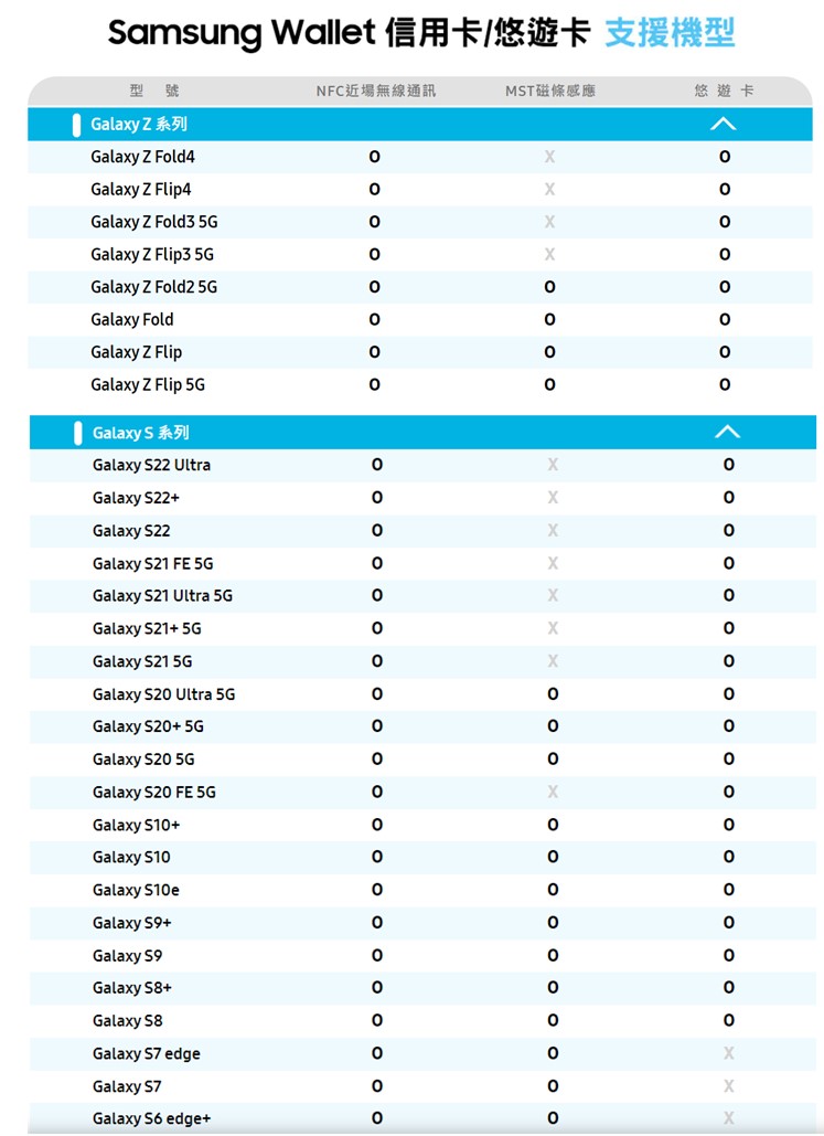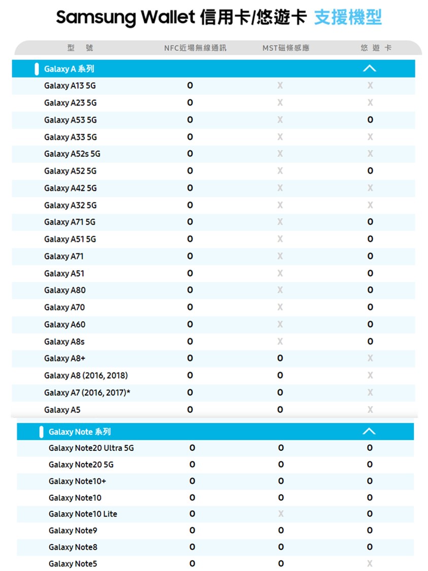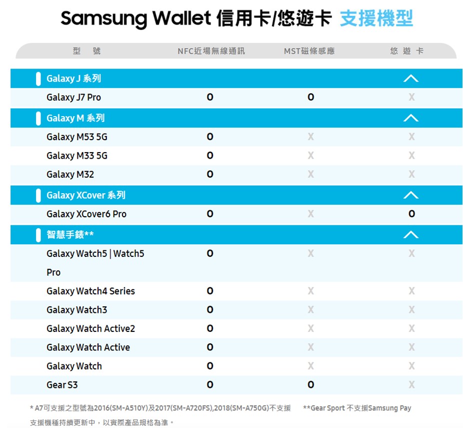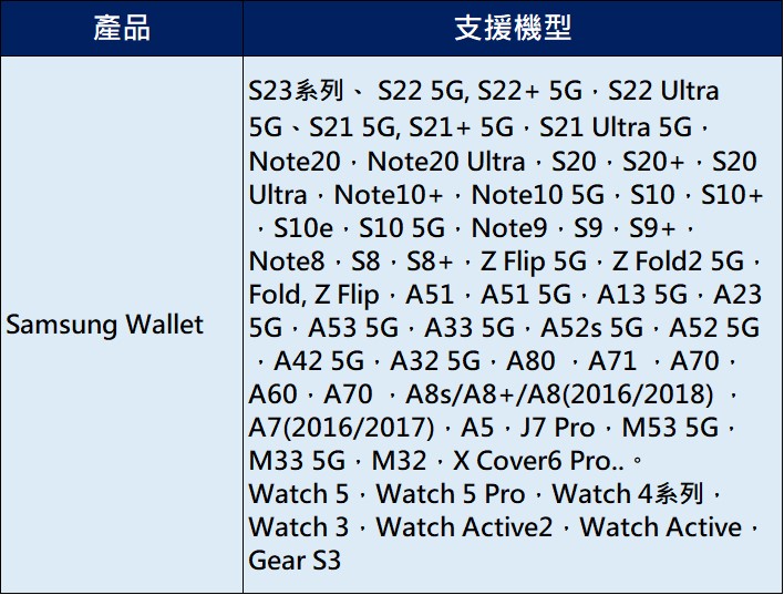 新版Samsung Wallet服務將可在搭載Android 9版本作業系統以後的Galaxy系列手機與Watch,支援機型包含S23系列、 S22 5G, S22+ 5G,S22 Ultra 5G、S21 5G, S21+ 5G,S21 Ultra 5G,Note20,Note20 Ultra,S20,S20+,S20 Ultra,Note10+,Note10 5G,S10,S10+,S10e,S10 5G,Note9,S9,S9+,Note8,S8,S8+,Z Flip 5G,Z Fold2 5G,Fold, Z Flip,A51,A51 5G,A13 5G,A23 5G,A53 5G,A33 5G,A52s 5G,A52 5G,A42 5G,A32 5G,A80 ,A71 ,A70,A60,A70 ,A8s/A8+/A8(2016/2018) ,A7(2016/2017),A5,J7 Pro,M53 5G,M33 5G,M32,X Cover6 Pro, Watch 5,Watch 5 Pro,Watch 4系列,Watch 3,Watch Active2,Watch Active,Gear S3....等等。數位鑰匙功能則計畫在今年第二季推出,預計支援BMW 1、2、3、4、5、6、7與8系列車款,而休旅車款則支援X5、X5M、X6、X6M、X7,以及包含Z4、iX、iX3、i4等車款。