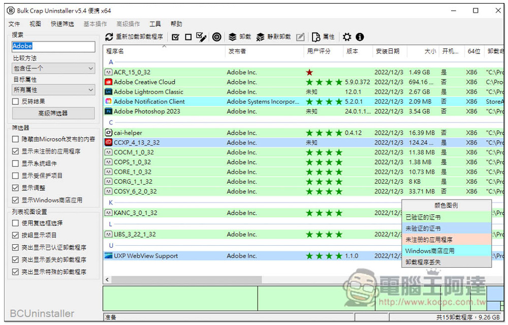 Windows 雖然本身就有新增 / 移除功能,可以移除掉電腦裡安裝的軟體,但相較於第三方工具,Windwos 內建的移除有時候不會清乾淨,甚至是移除失敗或沒顯示在清單上,這篇就要推薦一個比內建還好用,還是免費開源的 Bulk Crap Uninstaller,功能非常強大,不僅會掃描已安裝軟體,連免安裝都支援,而且每一款都會提供非常多詳細資訊,包括什麼時候安裝、信任度等等,讓你快速找出有沒有流氓軟體。