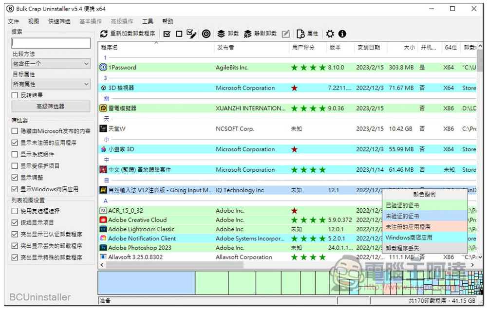 完成設置後,就會進到主畫面,每一款軟體都會顯示發布者、用戶評分、安裝日期、大小、位元等等,資料非常詳細,對於你不清楚的軟體,很建議看一下,來決定要不要保留。用戶評價我覺得參考就好,因為像微軟本身內建的 3D 檢視器、小畫家 3D 等都只有一顆星,但它們並不是流氓軟體,用這判斷不太準確:
