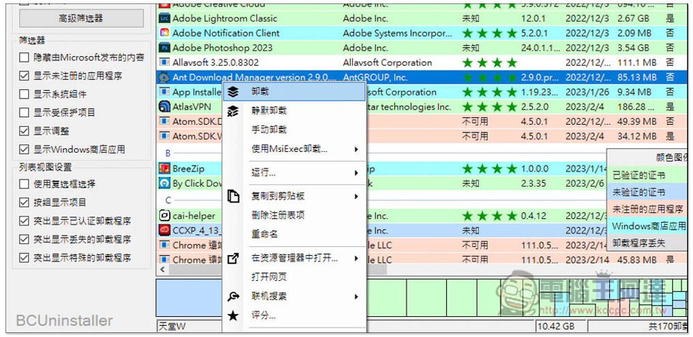 而移除步驟也很簡單,選取你要移除的軟體後打開右鍵選單,第一個就是卸載功能: