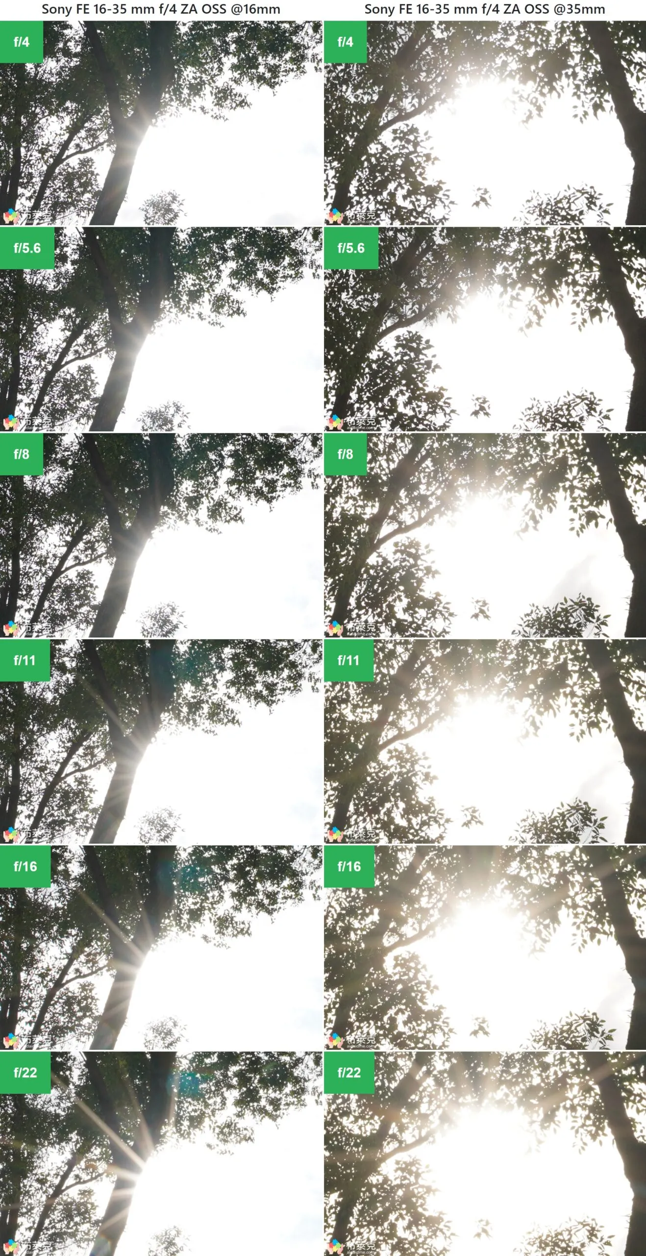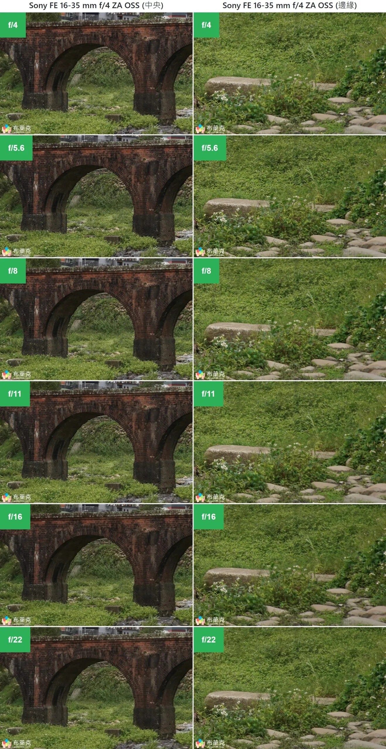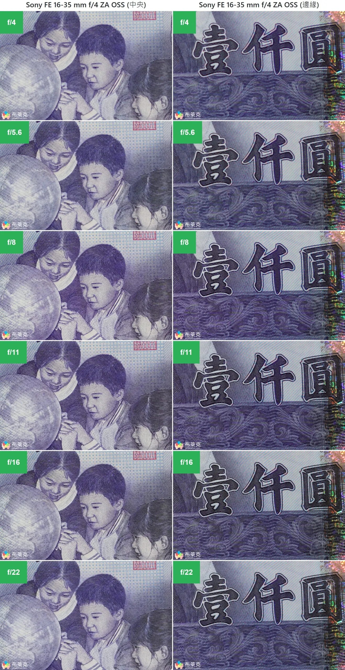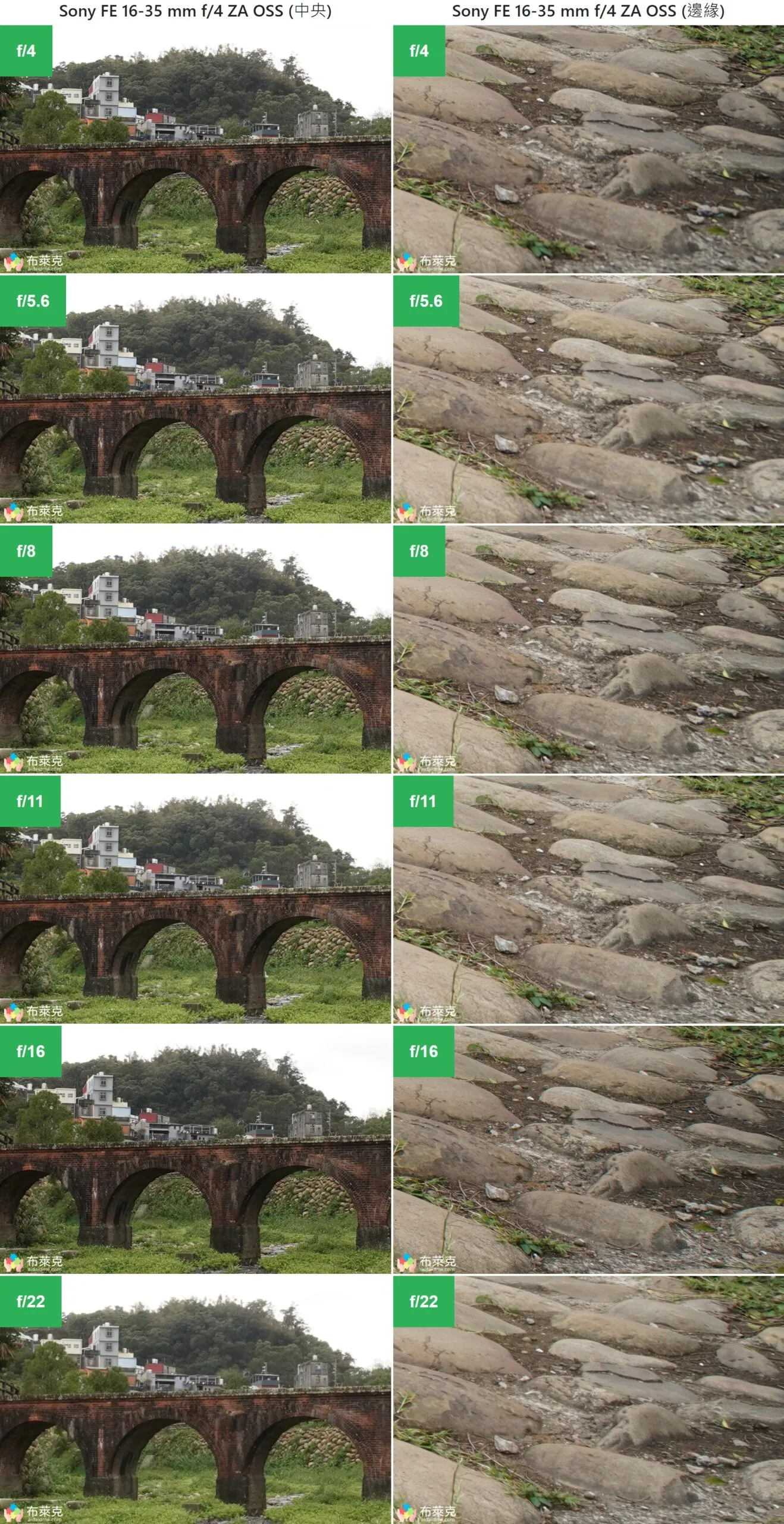 小編將鏡頭的光圈由最大的 f/4 漸漸縮小到 f/22 拍出以下的比較圖,放大到 1:1 的尺寸取出中央與邊角的畫面。同樣的構圖會在廣角端 (16mm) 與望遠端 (35mm) 都各做一次,各位可以仔細看看畫質如何。