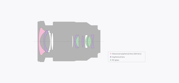 SEL1635Z 內部有 10 群 12 枚的鏡組設計,有 5 枚非球面鏡片,其中 1 枚是高級非球面鏡片 (AA),可以改善鏡頭成像變形且降低銳利程度的問題。3 枚超低色散 (ED) 鏡片,可以降低色散的問題。鏡片表面有蔡司獨家技術 T* 鍍膜,可以降低光線的反射情形。