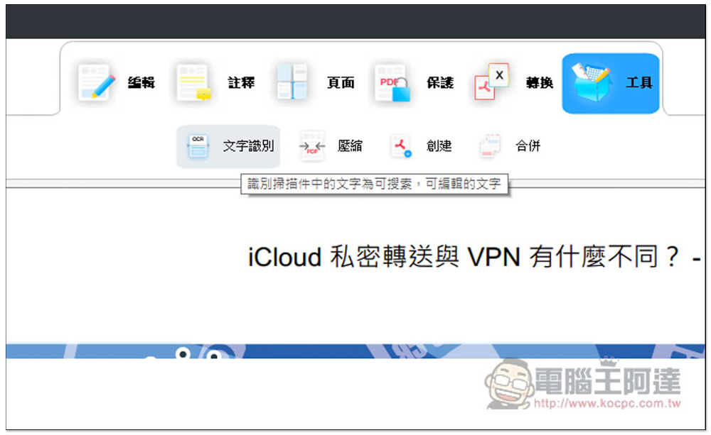OCR 文字識別在工具選單裡面,也提供 PDF 壓縮、PDF 合併功能: