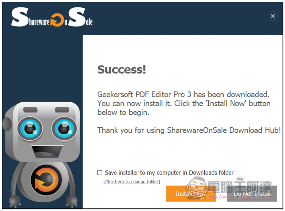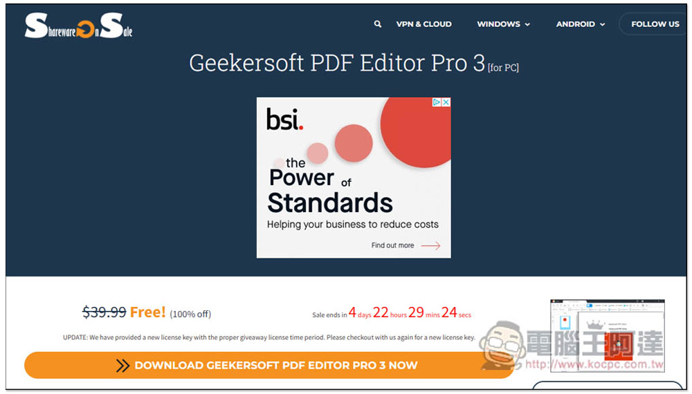 這次推出 Geekersoft PDF Editor Pro 3 限免的是大家非常熟悉 SharewareOnSale 網站,進到限免頁面後,點擊下方的 DOWNLOAD GEEKERSOFT PDF EDITOR PRO 3 NOW,目前還有四天多的時間: