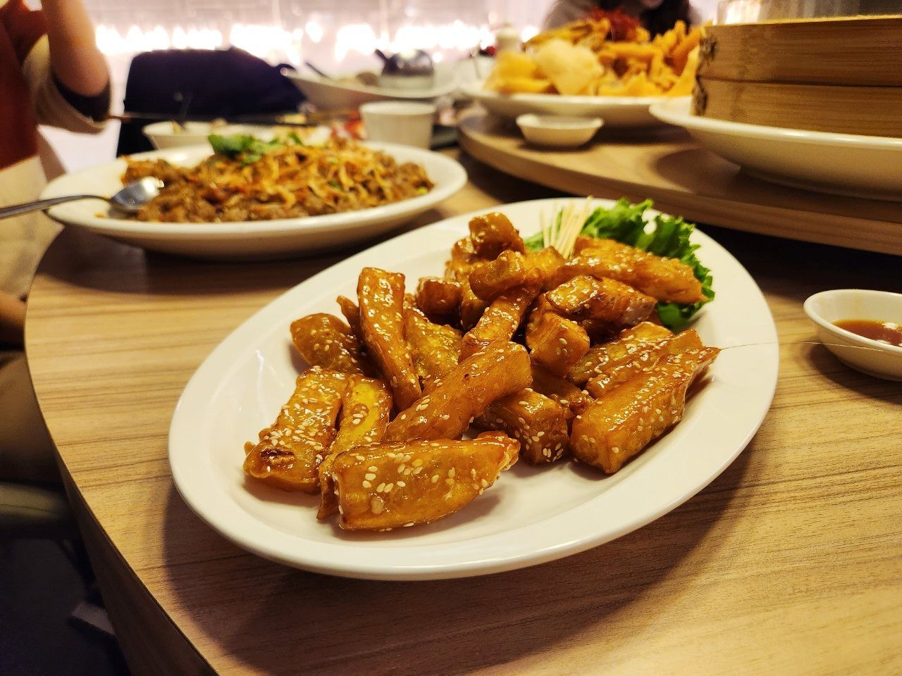 除了浮誇的帝王蟹料理外,店裡更有許多精緻川菜、湘菜等熱炒菜色,像是櫻花蝦米糕、炸黃金軟絲、剁椒魚頭等都是必點菜色,最後別忘了一定要點一道菜單裡沒有的隱藏版「拔絲地瓜」,金黃酥脆口感、甜而不膩的完美比例,讓人一口接著一口吃不停!(拔絲地瓜真的讓人魂牽夢縈)