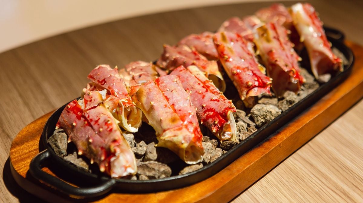 最後是妞編輯意外發現的必點料理方式「火烤帝王蟹」,上菜時店員會拿出一小杯「特調酒」淋在底部高溫的石頭上,瞬間大煙冒出、陣陣酒香撲鼻而來,不只好拍又引人注目,特殊的火烤方式讓帝王蟹嚐起來鮮甜又多汁。