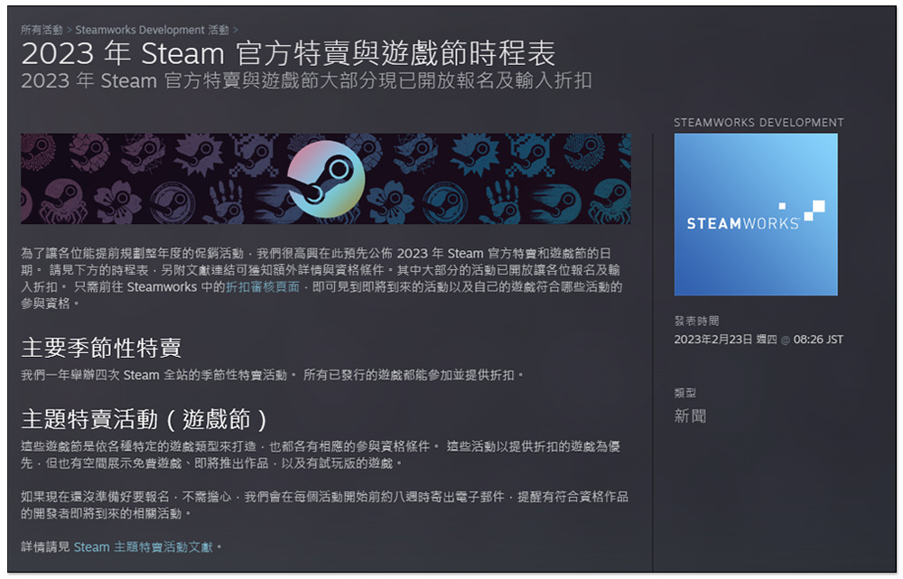 稍早在 Steamwork 的官方活動頁面中,Steam 就公告「2023 年 Steam 官方特賣與遊戲節時程表」,從內容可以發現,這篇公告主要是給開發者,讓他們方便安排 2023 年的銷售活動,看哪些活動符合他們的遊戲,但這間接也讓玩家們提早知道今年 Steam 的特賣活動安排時程。