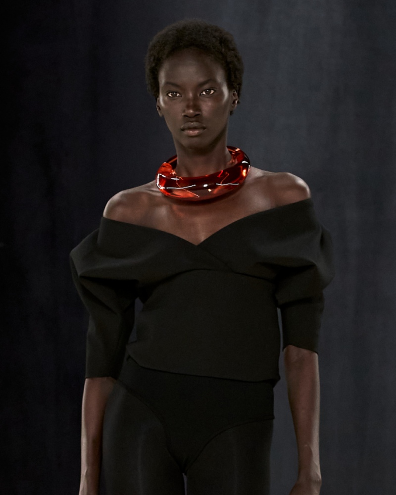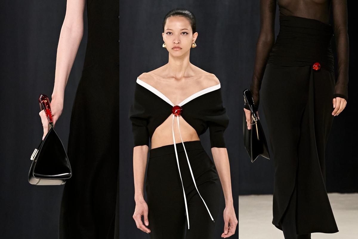儘管此次的秀場,創意總監Maximilian Davis回顧了50年代的巨星,但妝點的配件設計上可以看到並不是“墨守成規”的,流線型的設計,光滑而通透的紅色透明樹脂,有份量感卻不會太有攻擊性,反而自帶一種未來主義的氣息,可以從項鍊、包包的手提把、上衣與洋裝的點綴,都可以發覺設計的小巧思。