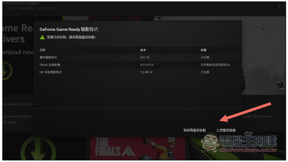 這時請打開 GEFORCE EXPERIENCE 軟體,進到驅動程式選單,就會看到有新版本更新,也就是 531.18 版本,發行日期為 02/28/2023,按右邊的下載: