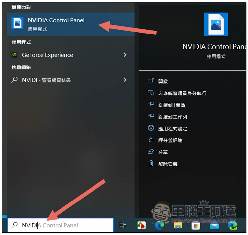 接著再次打開 NVIDIA 控制面板。如果你不知道這工具在哪,請於 Windows 搜尋列中輸入 NVIDIA Control Panel 的關鍵字即可找到: