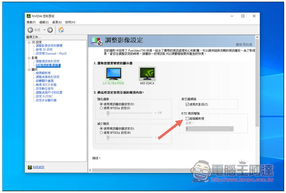 進到調整影像視訊設定後,右邊就會看到「RTX 視訊增強」的新功能,把超高解析度打開,這樣就完成了: