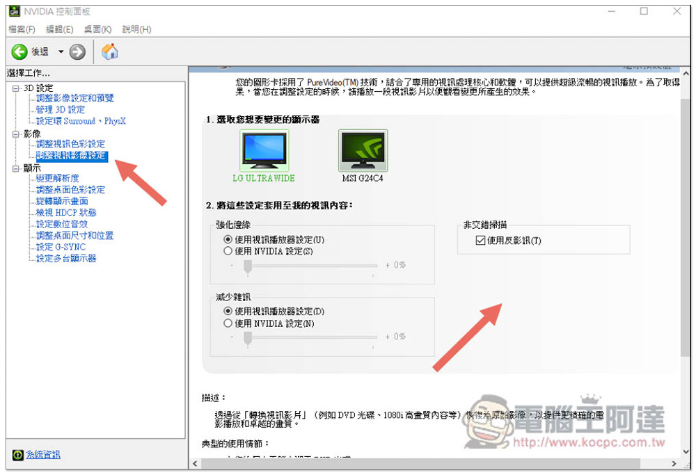 要使用 NVIDIA RTX Video Super Resolution 功能,除了必須是 RTX 30 系列和 RTX 40 系列顯示卡之外,你也必須把驅動程式更新到 Game Ready 531.18 版本以上,要不然在 NVIDIA 控制面板中是找不到這功能的,如下圖所示,功能設定會在右邊箭頭這邊: