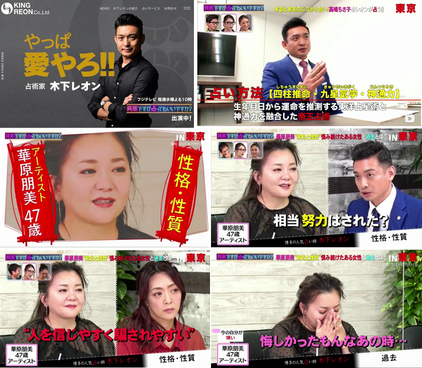 木下レオン老師在節目中有著「來自日本博多的占卜世家,兼具人氣和實力的神準占卜師」這樣的厲害抬頭,並憑藉著他獨創的【帝王占術】能直接解讀對方的性格、過去及未來。不僅為眾多藝人進行現場鑒定,有時也會透過現場連線幫素人進行鑒定,他的精準占中絕對讓看過的人都佩服的五體投地。其中,近期最具話題的就是木下レオン老師為日本歌姬華原朋美的鑒定啦!老師在為她鑒定性格特質時,直斷她「容易相信別人,是很好騙的類型」,這也讓華原朋美想起往事不禁在節目中落下眼淚,木下レオン老師精準的鑒定不僅節目來賓頻頻感到驚訝,連隔著螢幕觀看的日小編都直起雞皮疙瘩!最後這集的鑒定內容還掀起日本媒體一陣爭相報導呢!