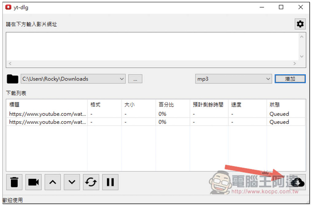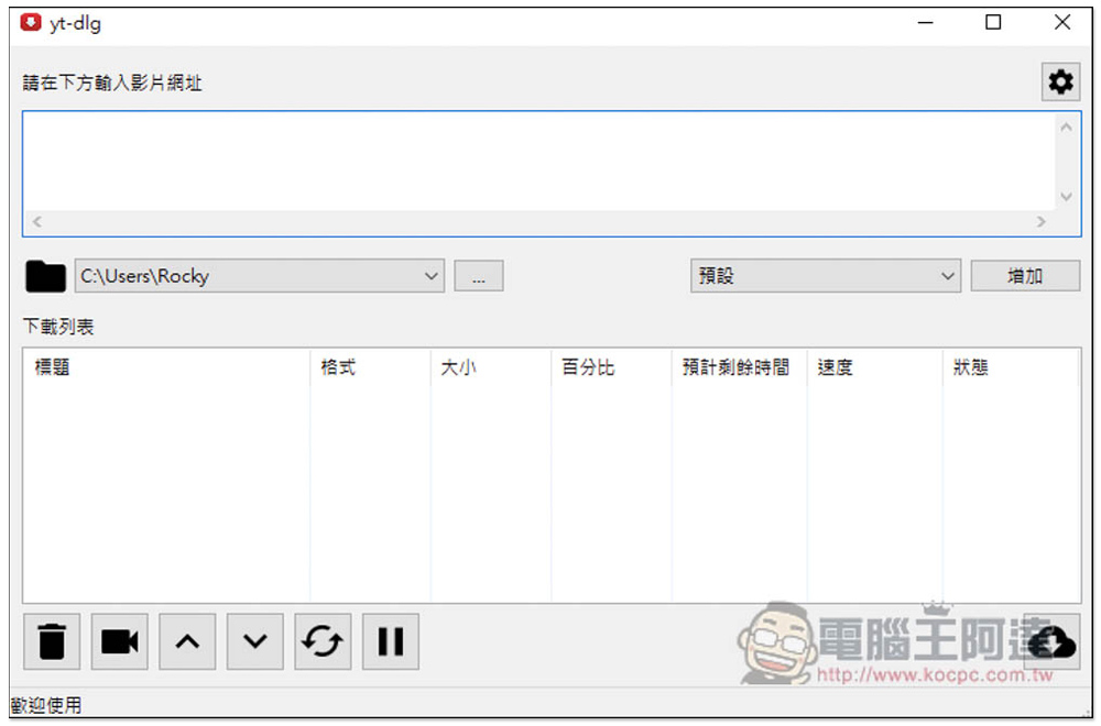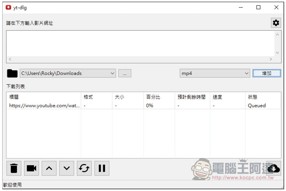 打開之後就可以開始使用,主要分成三部分,最上方貼上你要下載的影片網址,接著中間是設置下載儲存位置和你要的格式,最下方則是下載列表,加入列表後還需要按啟動才會開始下載: