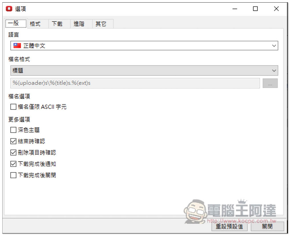 一般頁面裡可以設定語言、檔名格式,與支援深色主題: