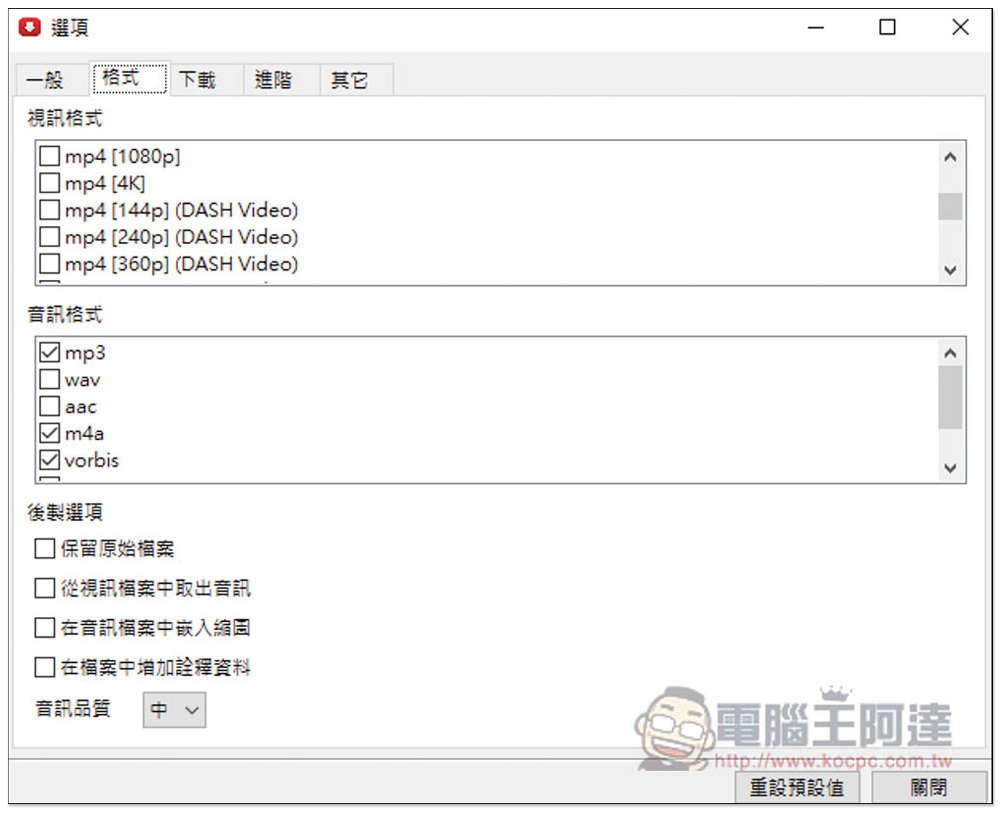 在設定的格式頁面中可找到,打勾的會出現在下載前設定格式清單裡,就把你想要的都打勾,視訊、音訊都有不少格式選擇,最下面還有後製選項,有「保留原始檔案」、「從視訊檔案中取出音訊」、「在音訊檔案中嵌入縮圖」、「在檔案中增加詮釋資料」、以及設定音訊品質: