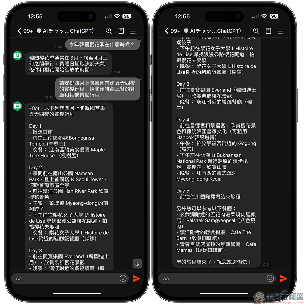 像是請 ChatGPT 安排赴韓國首爾的賞櫻行程,它也能整理每日的行程內容,不過目前請 ChatGPT 規劃旅遊行程還有許多待精進的地方,除了餐廳是否真實存在,以及旅遊各景點的順序,還是建議各位需要多次確認一下,否則按照它的建議,有可能會導致花許多時間在景點之間的移動。