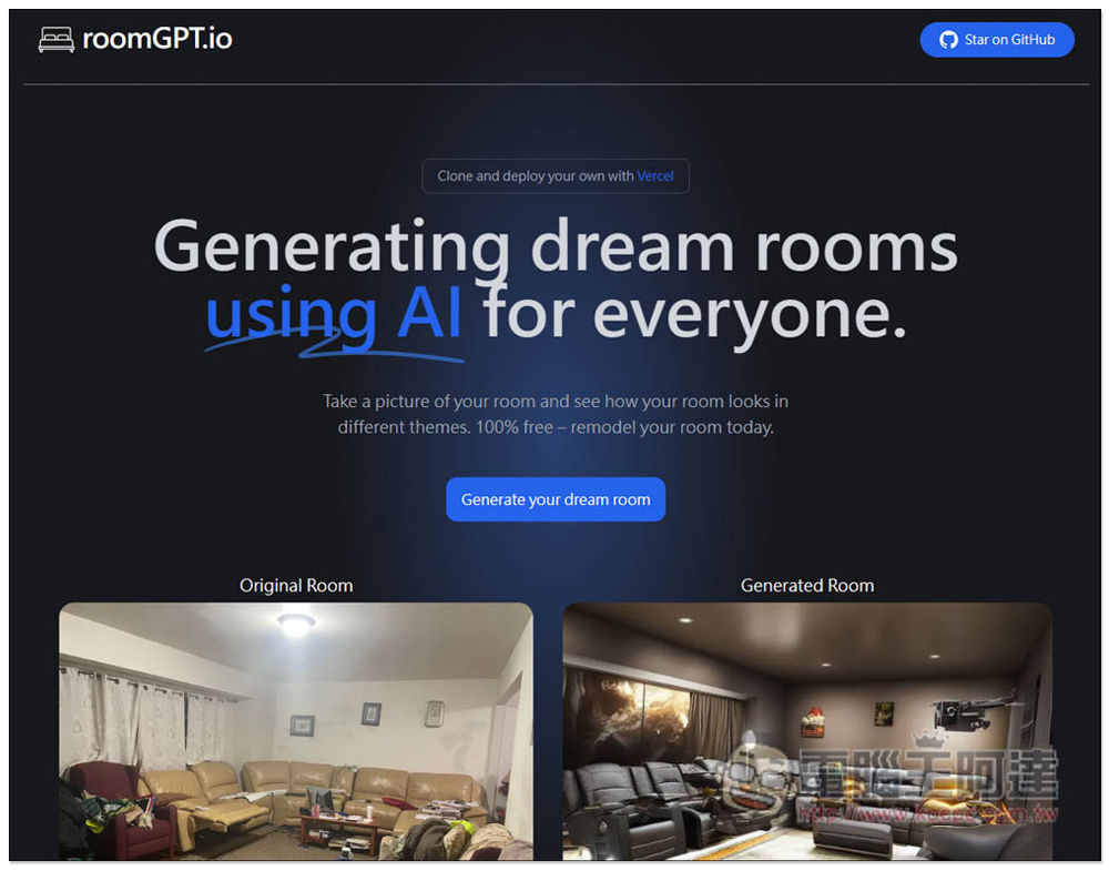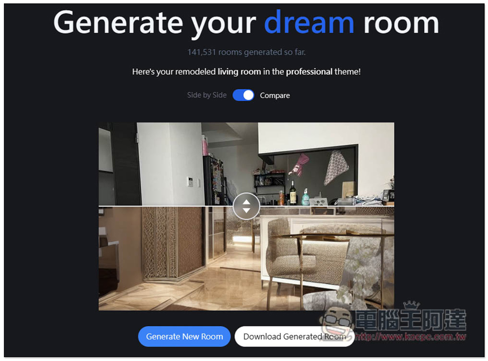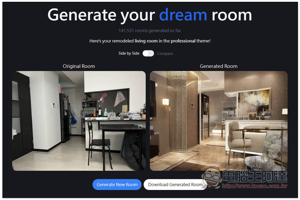 roomGPT.io 的使用方式很簡單,無需註冊,進到網站之後,下面有一張比對圖讓你參考,這比對圖蠻厲害的,看起來完全無破綻,感覺就像是真的裝潢過後的實照,但測試自己的照片多少還是會看到一些奇怪的地方。點擊中間的 Generate your dream room:
