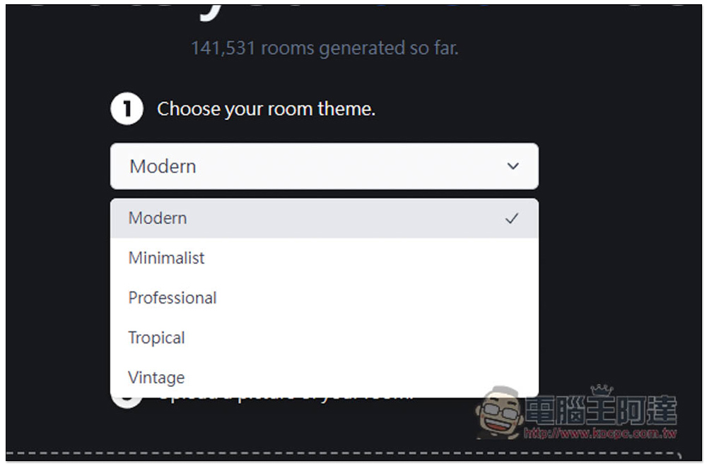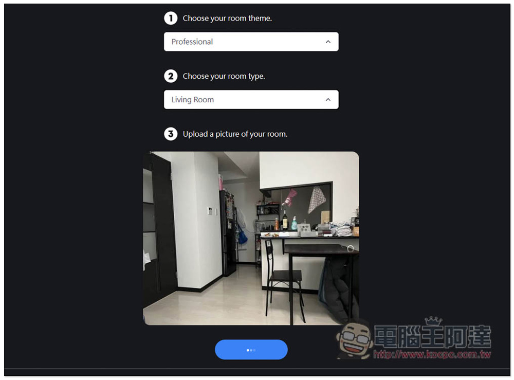 會跳轉到這頁面,三個步驟,第一選擇你喜歡的風格佈景(Choose your room theme.),第二選擇你房間的類型(Choose your room type),第三則是上傳照片: