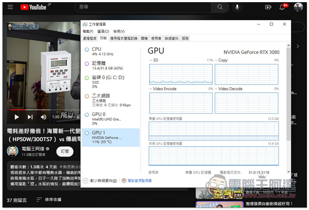 完成之後打開,就會自動啟用影片解析度功能了。而要測試有沒有成功,可以隨便打開一部 YouTube 影片,確認播放時 GPU 使用有提升,有的話就代表成功,沒有很可能是你的處理器不支援。