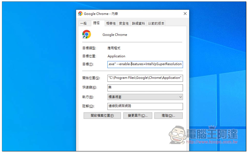 如果這些條件都符合,那請打開 Chrome 捷徑右鍵選單的內容,然後在目標的後方加上 --enable-features=IntelVpSuperResolution,如下圖所示,沒問題就按套用確定。會要求提供系統管理員權限,按繼續即可: