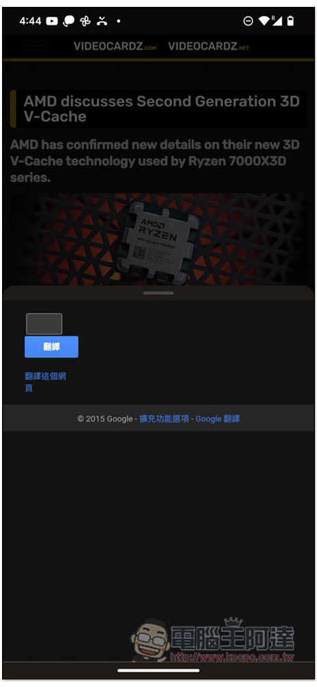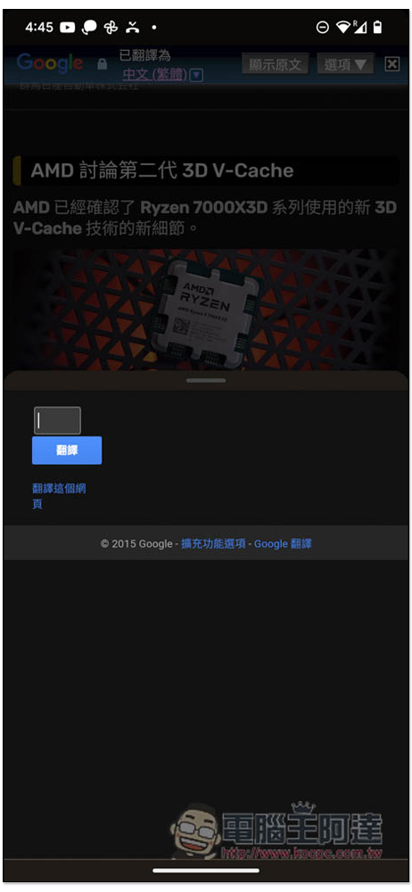 在任何一個網頁都能啟用擴充功能,只不過介面部分可能沒有針對行動版優化,因此有些顯示很奇怪,像是 Google 翻譯,輸入框超級小: